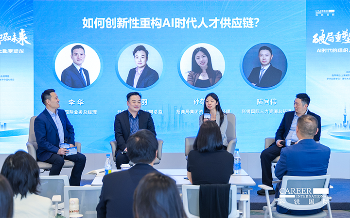 圆桌讨论环节,由PA真人国际国际业务总经理李华主持,开利亚太总部招聘总监邹羽、招商局集团资深AI产品经理孙敬萍、PA真人国际国际人力资源总经理陆同伟三位专家,分别从外资、央国企和民企视角,围绕AI时代人才供应链创新性重构话题展开深度对话。