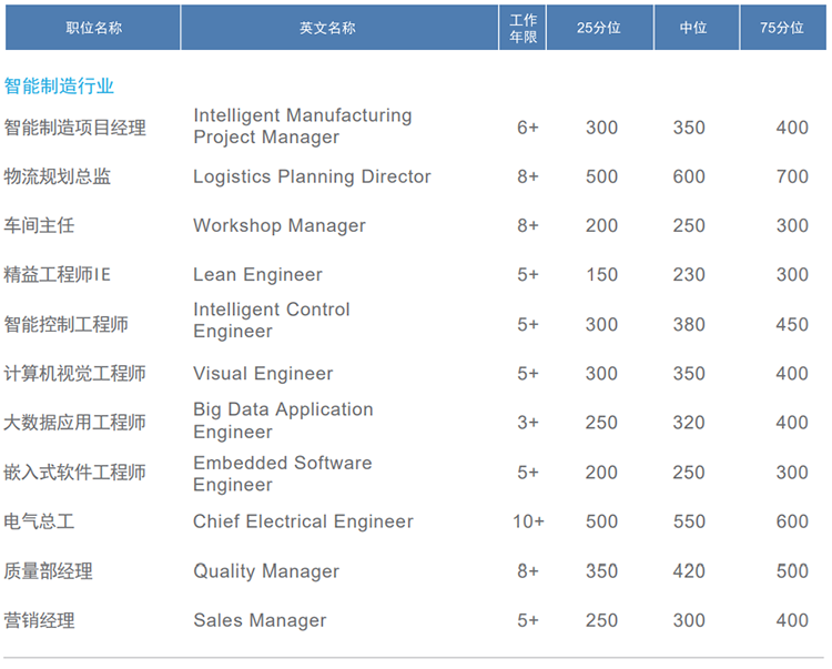 智能制造行业整体薪酬呈上涨趋势,薪酬上涨最快的为研发和技术类岗位,平均薪酬上涨幅度为20%-30%,其中薪酬涨幅较为明显的有人工智能、工业互联网、物联网、高科技制造业四大细分板块,涨幅较大的可以达到30-40%。质量岗位、生产岗位增长较为平稳,自然涨幅为10%-20%,跳槽涨幅为15%-30%。