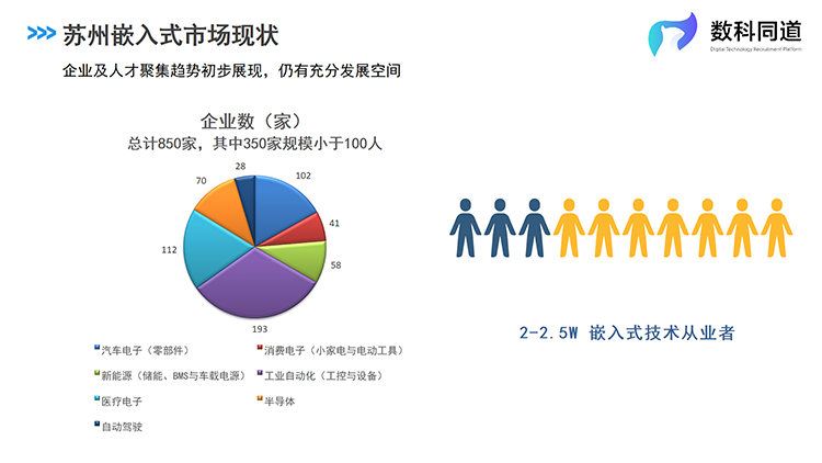 根据PA真人国际国际人力资源公司及数科同道业务团队对苏州市场的详细调研,现在苏州全市拥有嵌入式研发团队的企业数量为850家,主要集中在工业自动化、医疗电子、汽车电子等细分行业,其中百人以上规模企业500家。